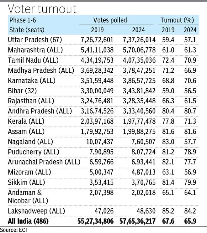 Kerala, Uttarakhand, Manipur, Mizoram, Nagaland, and Andaman and Nicobar are the six states and UTs that saw a decline in absolute voter numbers. Number of voters in Kerala in the 2024 polls reduced by 6 lakh compared to 2019, Uttarakhand recorded 90,000 lesser voters, and crisis-hit Manipur had 40,000 lesser people come out to vote this LS polls.